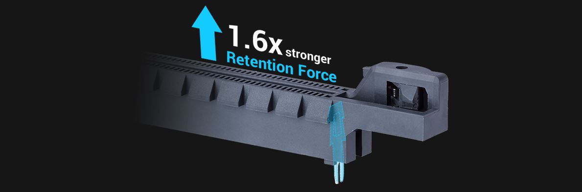 SafeSlot Core je exkluzivní PCIe® slot ASUS. Díky zesílené konstrukci, která je zakotvena na základní desce speciálním hákem, nabízí Safeslot Core 1,6x silnější pevnost a 1,3x větší odolnost proti ulomení než standardní rozšiřující sloty.