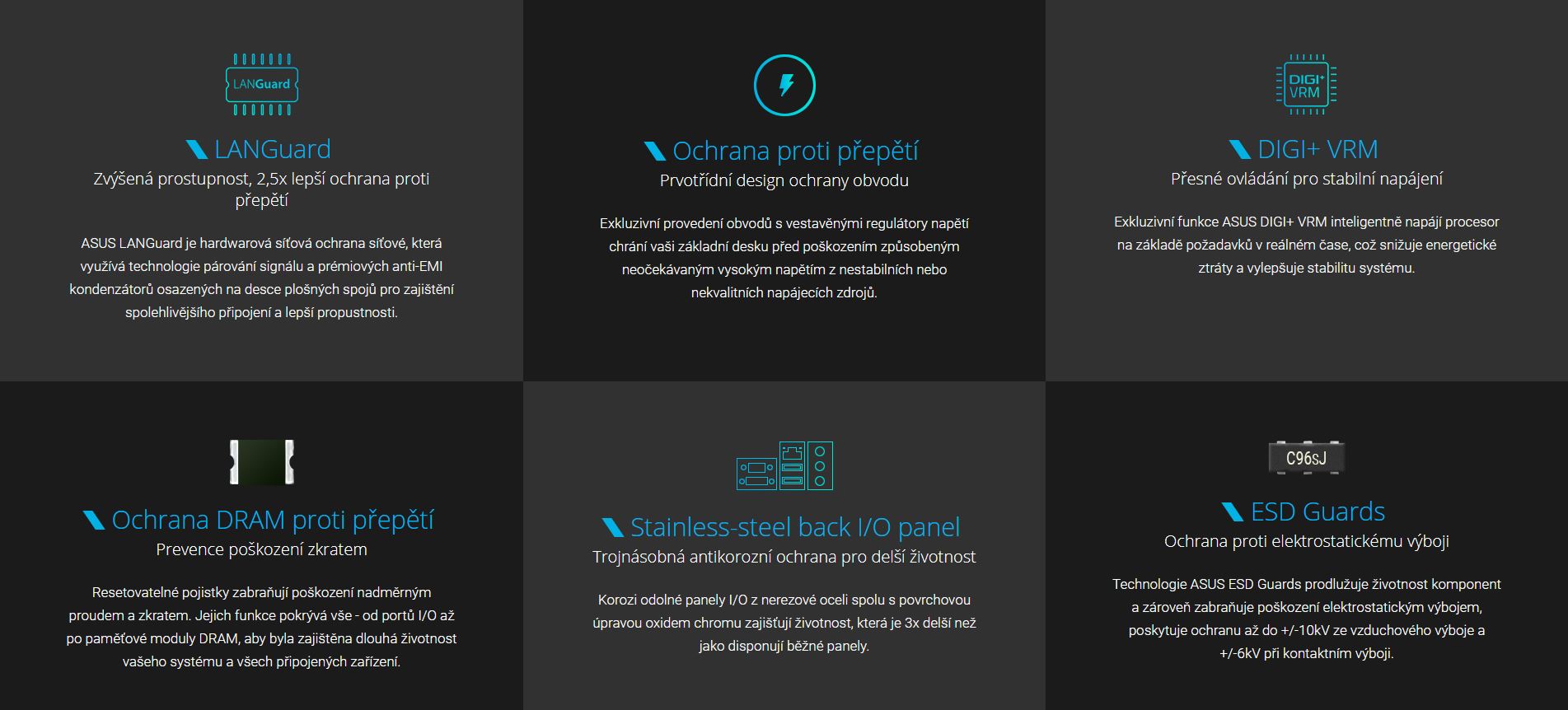 Řada 300 základních desek Prime je vybavena renomovanou technologií 5x Protection III, používá prvotřídní komponenty, vynikající design obvodu a náročné standardy zaručují kvalitu a dlouhodobou životnost této základní desky. To znamená výjimečnou ochranu a stabilitu pro vaší sestavu – díky desetiletím zkušeností tohoto předního výrobce základních desek na světě.