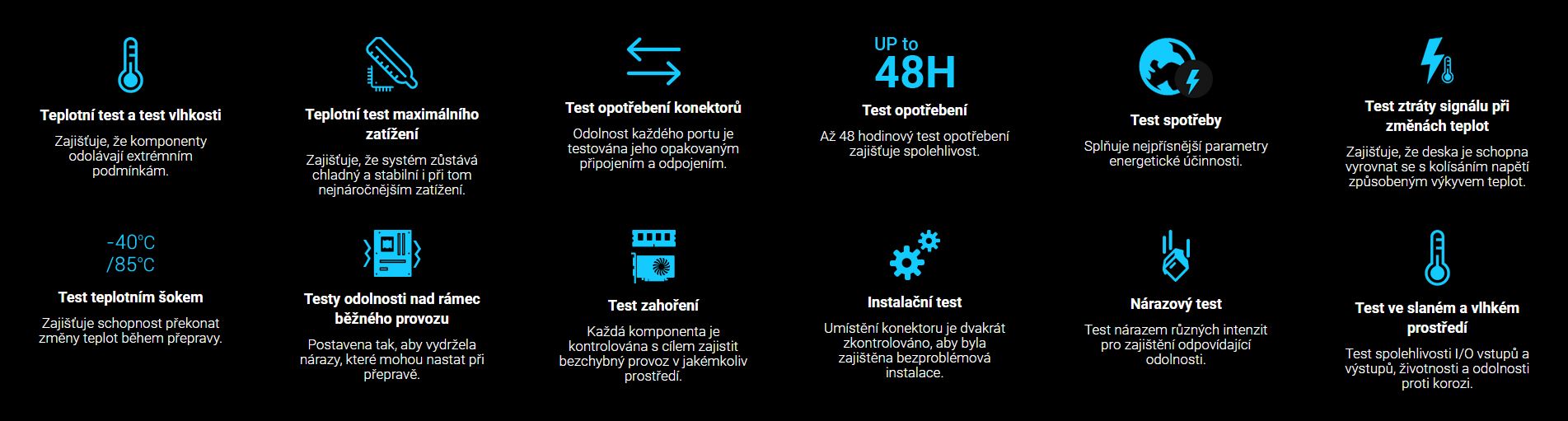 Základní desky ASUS se pyšní vynikající odolností. Každá deska je podrobena více než 8000 hodinám přísných testů. Testy zahořením, testy životního prostředí, testy kompatibility, softwarové testy a bezpečnostní testy potvrzují, že naše desky jsou mimořádně stabilní. Naše testy jsou ve svém odvětví jedinečné a přísnější než průmyslové standardy. Chceme si totiž být jistí, že každý náš produkt je zkonstruován tak, aby fungoval bezchybně v každém prostředí.