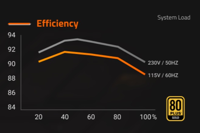 Certifikát 80 Plus Gold zaručuje 90% účinnost při 50% zatížení. Lepší energetická účinnost vede k menšímu plýtvání energií, nižšímu zahřívání a snížení hluku ventilátoru.