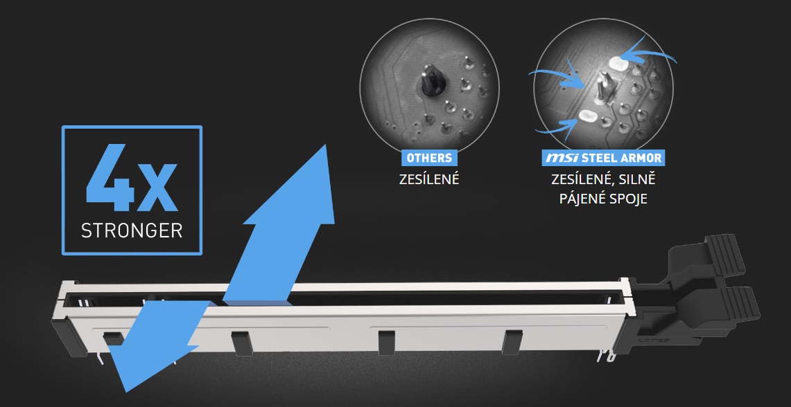 Sloty MSI PCI Express Steel Armor jsou k základní desce připevněny pomocí dodatečných pájecích bodů a unesou hmotnost těžkých grafických karet. Když se ve hrách počítá každá výhoda, Steel Armor chrání místo kontaktu před elektromagnetickým rušením.