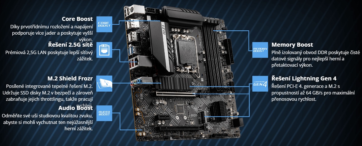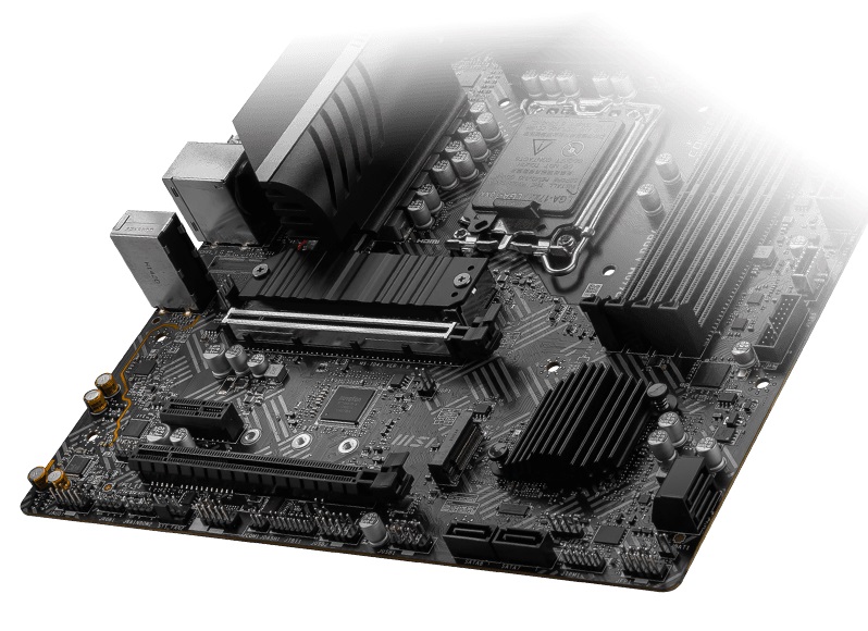 Základní desky MSI B660 PRO využívají procesory Intel Core 12. generace a jsou vybaveny nejnovějším rozhraním Lightning Gen 4 M.2, což je nejrychlejší řešení integrovaného úložiště na trhu s přenosovou rychlostí až 64 Gb/s.