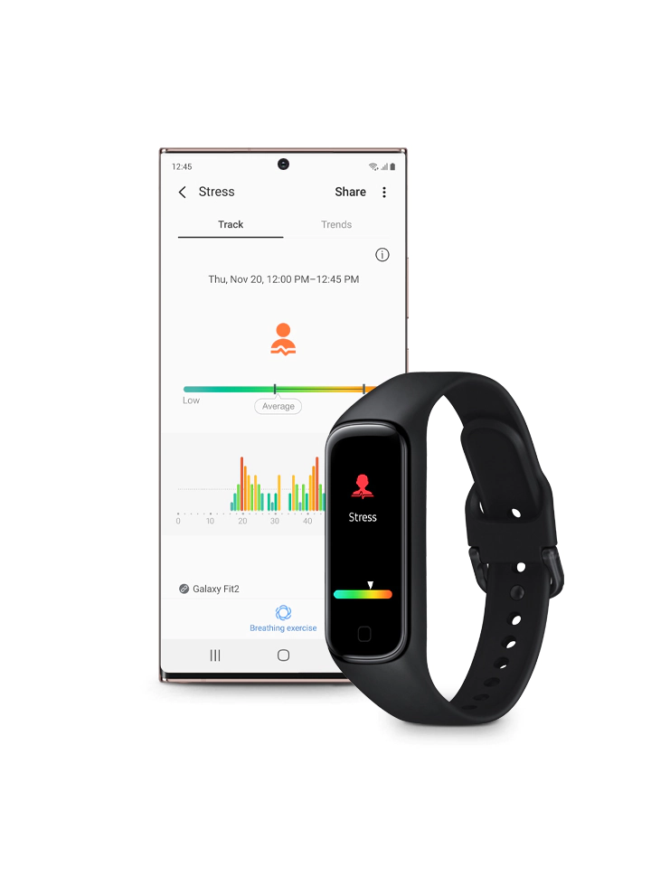 Zvládání stresu je důležitou součástí udržení zdraví po psychické i fyzické stránce. Nastavte si svůj Galaxy Fit2 pomocí aplikace Samsung Health tak, aby automaticky sledoval hladinu stresu, a vy tak můžete kdykoli při zvýšeném stresu vyzkoušet dechová cvičení. Zhluboka se nadechněte a relaxujte.