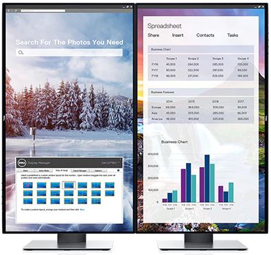 Více možností multitaskingu: Snadno uspořádejte více aplikací pomocí předdefinovaných šablon nebo upravené šablony pomocí funkce Easy Arrange v softwaru Dell Display Manager. Navíc můžete snadno uspořádat aplikace do dlaždic v rámci více monitorů.