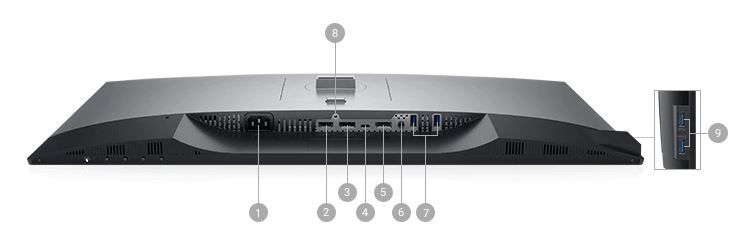 1. Síťový napájecí port | 2. Port HDMI | 3. Port DP (vstupní) | 4. USB-C / DisplayPort | 5. Port DP (výstupní) | 6. Linkový zvukový výstup | 7. Porty USB pro připojení periferních zařízení (1 s možností nabíjení) | 8. Zámek stojanu | 9. Porty USB pro připojení periferních zařízení (1 s možností nabíjení)